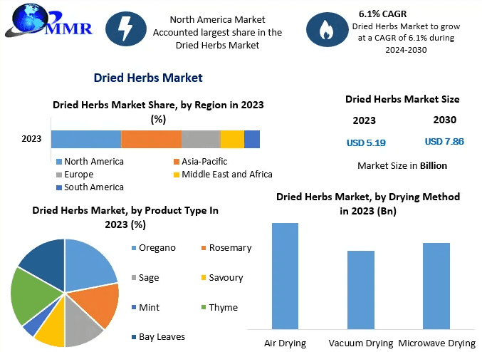 The Dried Herbs Industry is projected to grow from USD 5.19 billion in 2023 to USD 7.86 billion by 2030, registering a CAGR of 6.1% during the forecast period. Dried herbs are dehydrated plant leaves used to enhance flavor, aroma, and shelf life in various applications, including food processing, cosmetics, and pharmaceuticals. Drying methods such as air drying, vacuum drying, and microwave drying are employed to reduce moisture content, thereby extending shelf life and reducing the risk of microbial contamination.