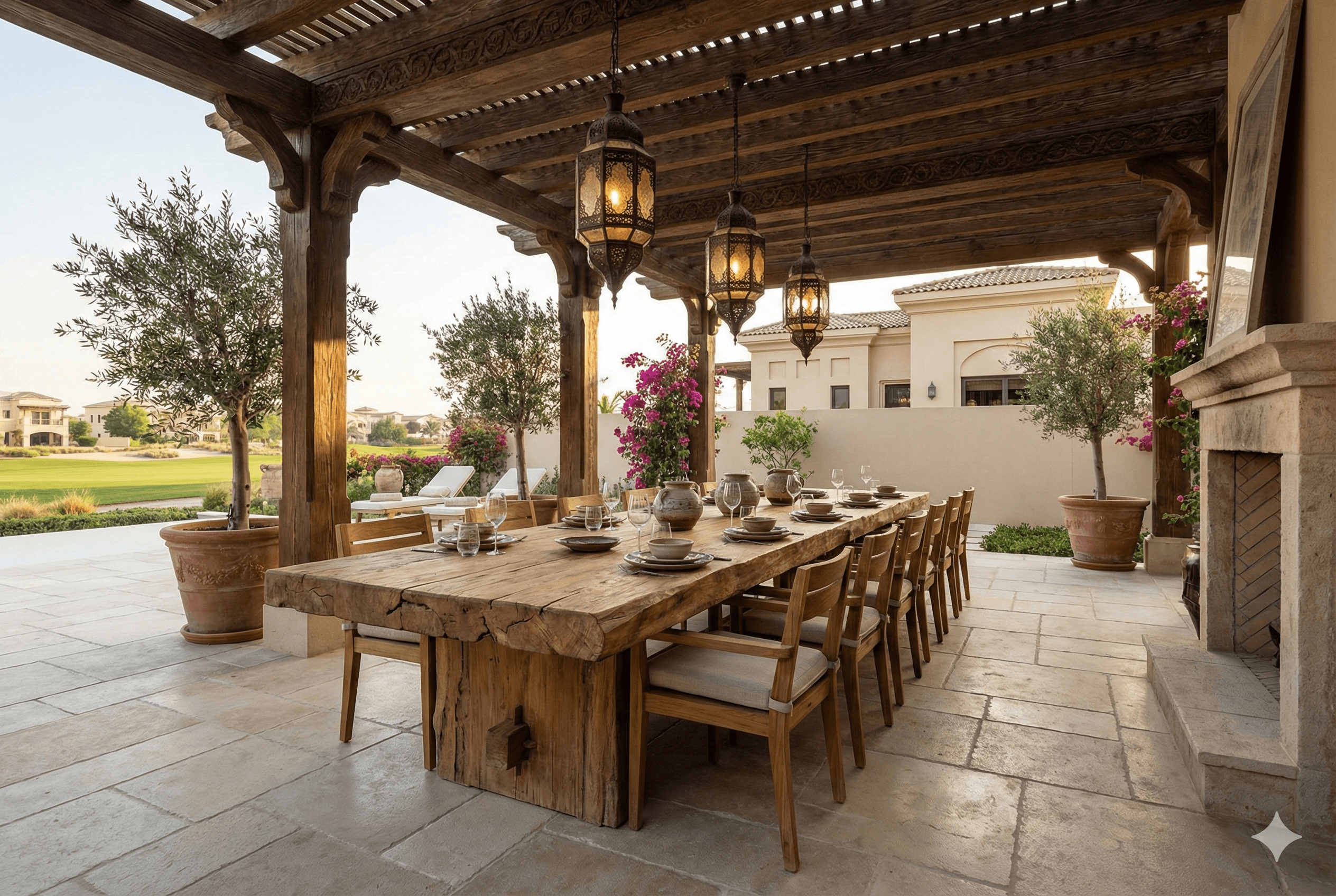 Spanish Colonial design draws from Andalusian courtyards, where life unfolds around a central open-air room. The atmosphere feels intimate, sun-kissed and layered with artisanal detail. For Al Hamra Village patios, this style delivers three essential qualities: