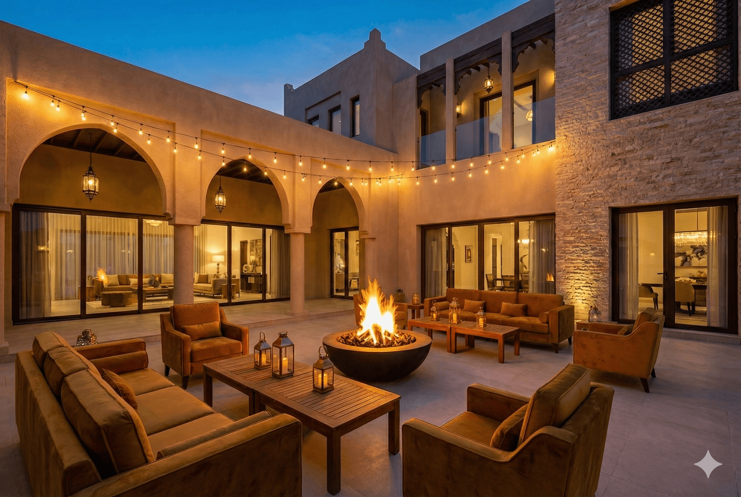 This layered lighting scheme turns an Al Hamra Village patio into an enchanting evening retreat.