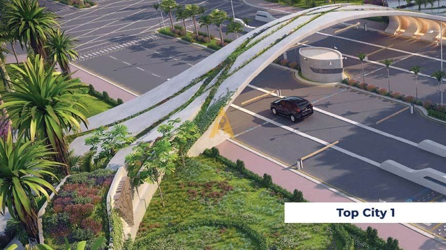 The amenities offered in Top city – 2 include a world-class shopping mall, five-star hotels, an international airport, and a golf course.
