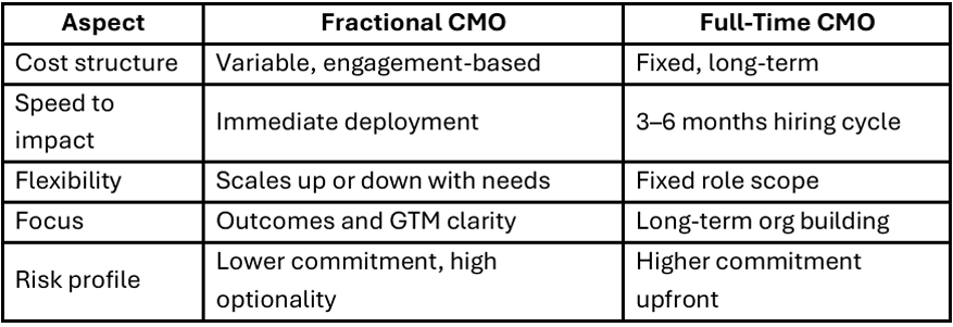 This distinction is why fractional CMO vs full-time CMO discussions increasingly surface during funding rounds, market expansions, or go-to-market resets.